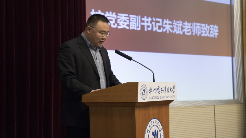 朱斌致辞,他对材料与环境工程学院十年来取得的成绩高度肯定,他认为材环学院今日的成绩是几届班子团结一心、奋力拼搏的结果,是全体专任教师甘坐冷板凳、十年磨一剑的结果,是全体材环学子刻苦钻研、追求上进的结果,并对材环学子给予了殷切的期望,希望他们奋发进取,筑梦材环。