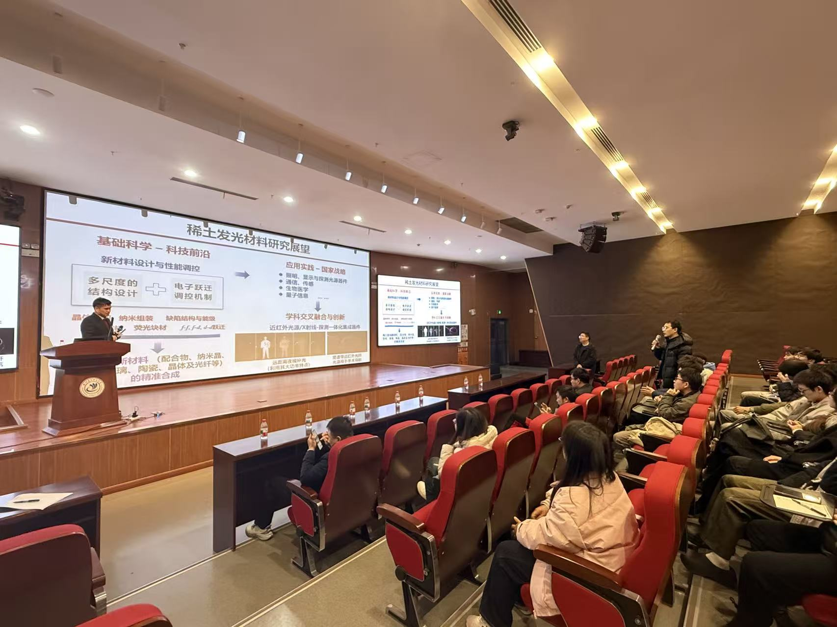 首先,华南理工大学夏志国教授以“稀土4f-5d跃迁发光调控与新材料创制”为题带来了精彩报告。夏志国教授以稀土4f-5d跃迁发光调控与新材料创制为主要研究方向,揭示了原型晶体结构、结构局域对称性及掺杂离子占位对稀土4f-5d跃迁的发光调制规律和机制,创制出系列新型无机氧化物基红色-近红外发光材料,揭示了提升稀土离子4f-5d跃迁发光热稳定性的缺陷能级调控机制,实现了发光效率和热稳定性的协同优化;夏志国教授还利用稀土4f-5d跃迁优化闪烁发光过程,创制出系列Eu2+和Ce3+基卤化物发光材料,扩充了金属卤化物闪烁体材料类型。夏志国教授的报告以其前瞻性的学术视野,给予了在场师生多方面的学术启示。